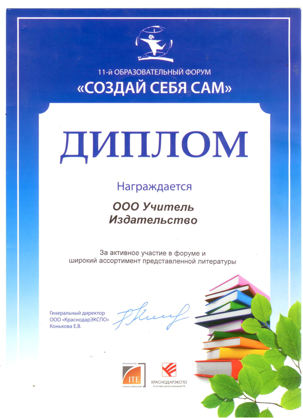 С 15 по 17 марта 2012 года в Выставочном центре «Краснодар ЭКСПО» г. Краснодар состоялся 11-й образовательный Форум «Создай себя сам». Девиз форума «Завтра начинается сегодня». Экспозиции форума «Образование.Карьера.Общество», «Книжный мир», «Образование за рубежом» представили всё самое лучшее, что есть сегодня на рынке образовательных услуг Краснодарского края. Издательство "Учитель" уже третий год успешно представляет новинки книжной и электронной продукции в сфере учебно-методической литературы. Особенно, педагогами Краснодарского края были отмечены серии: "Новые стандарты: учимся работать", "ФГТ в ДОУ : от теории к практике". "Портфолио", "Пособия для ОУ VII-VIII видов" и др. На форуме обсуждались такие актуальные вопросы как "Управление процессом введения ФГОС НОО в ОУ", "Современные интерактивные устройства обучения", "Консультации ЕГЭ" и др.